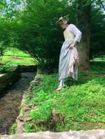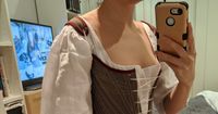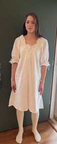 A shift is the most basic undergarment needed for an 18th century woman. This shift is made of a linen and cotton blend so it is breathable as well as affordable. The neckline has a wide band so that a drawstring may be added at the wearer's discretion. The 3/4 sleeves also close with a drawstring. The fabric of this shift is very soft against your skin.