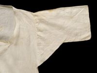 It was usually made of linen and was the item of underwear worn next to the skin, underneath the body-shaping stays. The short, ungathered sleeve and wide, shallow, ungathered neckline correspond to women’s fashions of the first two decades of the 19th century. It is a development of the 18th century shift which was similar in style and materials.