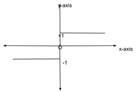 The range is the possible value of y, we can see from the graph that the values can be -1, 0, and 1.Therefore, range is $\\left\\{ -1,0,1 \\right\\}$Note: In the solution we have given two forms of signum function, one can break the value of