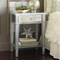 Amtiqued silvertone finish · 3 smooth-gliding drawers · Rivet details · No assembly required View All Details · $239.99 · (2) Glam style nightstand · Mirrored finishing · Painted with silver lacquered edge · Mirrored panels with crosshatch details · Fitted with three soft close drawer for bed side storage View All Details ·