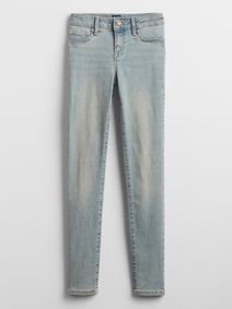 Shop Gap Factory's Kids Super Skinny Jeans: This product is part of our water-saving Washwell program. Compared with conventional wash methods, Washwell uses at least 20% less water., Stretch denim., Light indigo wash with fading and whiskering., Button closure (sizes 4-8 have a hook & bar ...