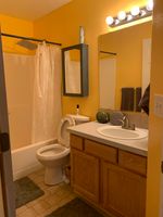 The half bathroom shares a wall with the tub side of the full bathroom.
