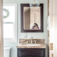 Hi all! My boyfriend and I have two bathrooms that look like this. I’m comfortable painting the walls myself, and I’m considering a very light blue (right now they are a gray purple).