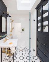 February 19, 2016 - A simple light-and-dark palette throughout the small bathroom helps the space appear larger, and the same neutral scheme appears in the vignette above the toilet. The dark tones on the shelves, picture frames, and art contrast with the white towels, photo mats, and bud vase. ... Mixing contemporary styles with antiques is the secret to this small bathroom remodel's signature look.
