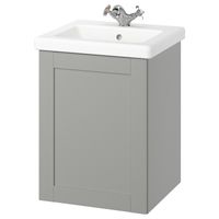 ENHET / TVÄLLEN Vanity w/ door/sink/faucet - gray/gray frame 50x49x66 cm (19 5/8x19 1/8x26 "). A base cabinet for sink with shelf that is perfect for hiding towels and hygiene products that often create clutter. Cleaning the floor is a breeze since this combination is wall-mounted.