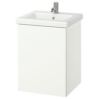 ENHET / TVÄLLEN Vanity w/ door/sink/faucet - white 50x49x66 cm (19 5/8x19 1/8x26 "). A base cabinet for sink with shelf that is perfect for hiding towels and hygiene products that often create clutter. Cleaning the floor is a breeze since this combination is wall-mounted.
