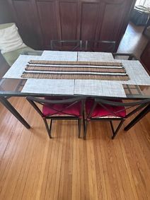 Condition of this table set is overall very good. The seats on some of the chairs are missing some of their screws, so until they are replaced the seats can come loose when carrying the chairs, but under normal use (sitting, scooting) the seats remain in place.