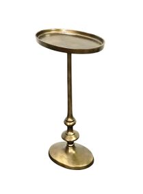 Crafted entirely from aluminum, it showcases a sleek antique gold finish that adds a warm, inviting glow to any room. Its pedestal base and slender metal legs create a streamlined silhouette, making it a versatile addition to both modern and traditional decor. With its compact size, this table is a great fit for small spaces, offering a convenient spot for your favorite book or a cup of coffee.