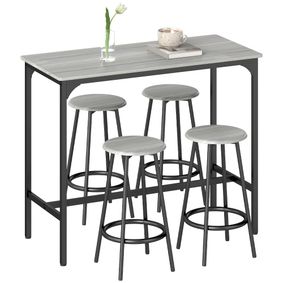 A space-saving grey dining set featuring a square table and two upholstered high-back chairs with steel legs. ... "Our 5-piece dining table set comes with a dining table and 4 chairs, maximizing daily dining enjoyment with your friends or family.