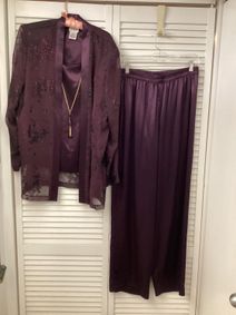Available in Regular Size and Plus Size Made in USA Fabric : Lace, Jersey Sleeve Style : Sleeveless with Matching Jacket Length : Long Top : 26" Jacket: 40 1/2 " Colors : Champagne, Navy, Plum, Slate, Coal, Peacock, Cadet Size : 4P, 6P, 8P, 10P, 12P, 14P Fully Lined Soft Cup Inserts Occasion... ... Roaman's Women's Plus Size Plus-Size Asymmetrical Lace Pant Set Long Sleeve Lace Scalloped Tunic & Elastic Waist Pants, Size:40 W, Red ... R & M Richards Pants & Jumpsuits | Rm Richards Embellished 3-Piece Jacket Dress 7449 | Color: Purple | Size: Various · A Stunning Suit Trio That Features A 3/4 Sleeve Open-Front Jacket With Rhinestone Trim, Along With A Matching Tank And Pants.