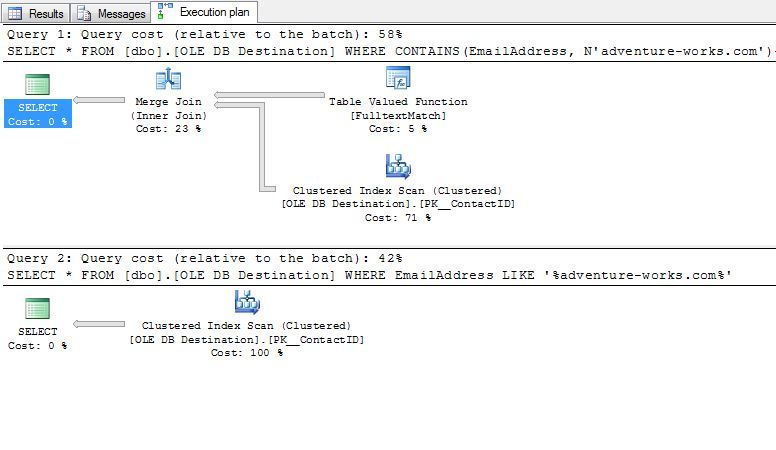 The CONTAINS also had a clustered index scan with additional operators for the full text match and a merge join.