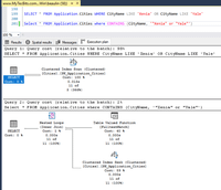 The CONTAINS also had a clustered index scan with additional operators for the full text match and a merge join.
