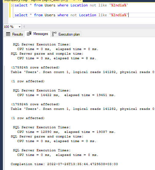 Please be mindful of leading wildcard in the where clause as it will have to do full column scan instead of seek operation as it needs to search the complete string.