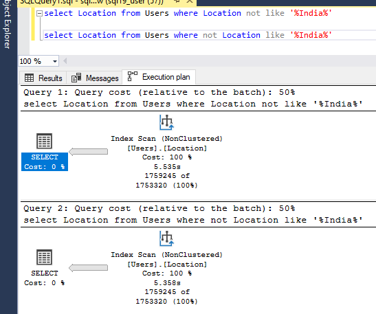 If I change the query and take only Location column in the select, Nonclustered index scan is performed however no change in the performance or execution plan.
