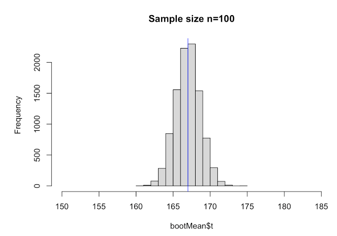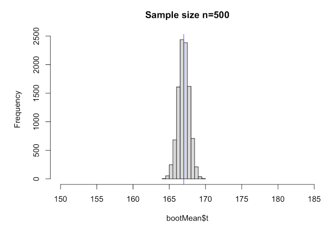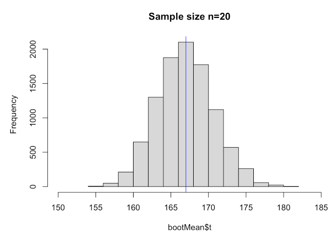 hist(bootMean$t, xlim=c(150,185), main="Sample size n=20")