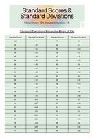 An easy to use table for converting standard scores to T scores, scaled, scores, and percentiles, with interpretations.