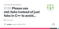I have also spent too much time in the past trying to work out why code like double precise_sine = std::sin(myfloat) gives imprecise results. Because I don't like wasting my time on these sorts of surprises, I tend to avoid the overloaded variants of standard C functions in namespace std. That is, I use ::fabs when I want a double to be returned, ::fabsf when I want a float out, and ::fabsl when I want a long double out. Similarly for ::abs when I want an int, ::absl when I want a long, and ::absll when I want a long long.