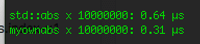 June 2, 2018 - I hope it’s OK to ask generic C++ stuff here… I’m playing around with various optimizations and approximizations, just having fun and trying to squeeze the odd microsecond out here and there. So I wrote my own approach to a function that turns a value into its absolute (positive) value, basically to measure it against std::abs(). This is my implementation: namespace Math { template inline const TYPE Abs (const TYPE& Value) { return Value + (Value