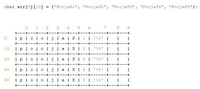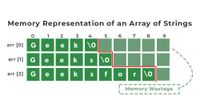 This assumes the size and number of strings in the initializer match up with your array dimensions. In this case, the contents of each string literal (which is itself a zero-terminated array of char) are copied to the memory allocated to strs. The problem with this approach is the possibility of internal fragmentation; if you have 99 strings that are 5 characters or less, but 1 string that's 20 characters long, 99 strings are going to have at least 15 unused characters; that's a waste of space.
