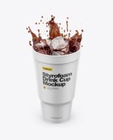 This high-angle shot mockup features a to-go Styrofoam cup filled with ice and liquid. A Coca Cola splash adds a refreshing touch to the cold drink, with droplets splashing over the top of the cup. Perfect for showcasing your designs in a realistic