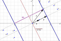June 5, 2017 - The first is the true distance from that point to the candidate hyperplane; the second is the inner product with $ w$. The two blue dashed lines are the solutions to $ \langle x, w \rangle = \pm 1$. To solve the SVM by hand, you have to ensure the second number is at least 1 for all green points, at most -1 for all red points, and then you have to make $ w$ as short as possible. As we’ve discussed, shrinking $ w$ moves the blue lines farther away from the separator, but in order to satisfy the constraints the blue lines can’t go further than any training point. Indeed, the optimum will have those blue lines touching a training point on each side.