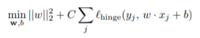 $$ \arg \min_{\boldsymbol{w}} \frac{\lambda}{2} {\left\| \boldsymbol{w} \right\|}_{2}^{2} + \frac{1}{n} \sum_{k = 1}^{n} \max \left\{ 0, 1 - {y}_{k} \boldsymbol{x}_{k}^{\top} \boldsymbol{w} \right\} $$