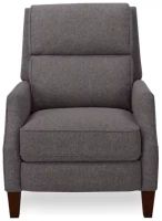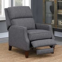 The Synergy Home Furnishings Storm Push Back Recliner goes from sleek accent chair to cozy recliner in one push. This cushy gray recliner features superbly soft fabric, sleek slope armrests, and tall tapered legs for a modern take on a classic concept.