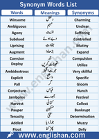 December 29, 2024 - Expand your English vocabulary with this comprehensive synonyms list from A to Z with Urdu meanings. This guide adds great variety to your speaking and writing skills, making it easier to enhance your communication in English. The inclusion of Urdu translations helps learners understand and ...