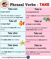June 20, 2019 - 11 English Phrasal Verbs With Take, Meaning, Example Sentences Take over to get control The firm was badly in need of restructuring when he took over. Take on to accept job or responsibility Don’t take on more responsibilities than you can handle. Take down to write on a paper I can take down the messages that come in.