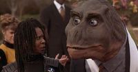 Other than that, it's a pretty weird animated movie. There's a dinosaur that loves hot dogs, an alien that Neweyes hires to round up the dinos, and the kids get turned into monkeys.