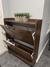 The small top drawer provides plenty of space for tucking away any loose household odds and ends, while a flat surface tabletop can be used as a decorative tabletop. Ultra-Slim Tipping Bucket 16 Pair Shoe Storage Cabinet · This smartly designed shoe cabinet has a tall, spacious design that allows for it to be easily matched with most any room décor.