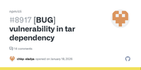 January 18, 2026 - Latest npm version uses the dependency: tar@7.5.2. During a CVE scan we found HIGH CVE for tar@7.5.2 (GHSA-8qq5-rm4j-mr97). The remediation is upgrading tar version to 7.5.3. Please upgrade to avoid exposure to the vulnerability.