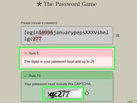 5 days ago - This is a list of rules in The Password Game in making a password. Your password must be at least 5 characters. Your password must include a number. Your password must include an uppercase letter. Your password must include a special character. The digits in your password must add up to 25. Your...