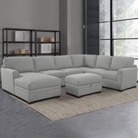 The Thomasville Langdon Sectional with Storage Ottoman offers quality features in fabric, construction, and styling. The sectional is covered in a smooth fabric that is composed of durable fibers. The comfort of this sectional goes beyond the fabric and into the cushion construction due to pocket coils and sinuous springs. The pocket coils and sinuous springs will provide consistent comfort and maintain great shape over time. The โUโ shape configuration features a sofa-chaise, which allows for additional seating. The ottoman cushion pulls open to provide storage space for blankets, magazines,