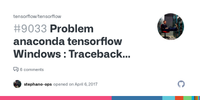 June 4, 2017 - Problem anaconda tensorflow Windows : Traceback <most recent call last>: File "<stdin>", line 1, in <module> ModuleNotFoundError: No module named 'tensorflow'#9033