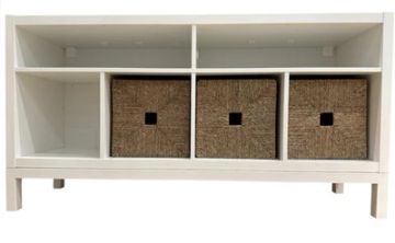 KALLAX TV bench - white 147x60 cm (57 3/4x23 1/2 "). The opening at the back allows you to easily gather and organize all wires. The simple design with clean lines makes KALLAX flexible and easy to use at home. The shelves align perfectly with the frame to create a strong and uniform expression.