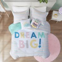 Brighten your child’s room with the playful charm of the Urban Habitat Kids Dream Big Cotton Printed Comforter Set. This cotton comforter features colorful stripes and the phrase, “Dream Big!” on the white base, for a bright and fun look. A solid aqua reverse adds a vibrant splash of color to the st