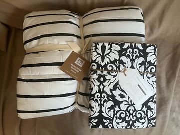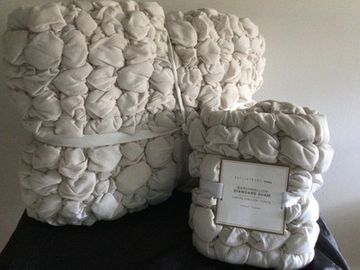 The twin quilts and comforters typically feature a cotton shell with cotton or polyester batting for warmth. The duvet covers use materials like organic cotton percale and require a duvet insert, available separately.