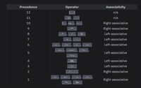 May 14, 2024 - The assignment operator (=) has right-to-left associativity. Therefore, the assignments are evaluated from right to left: b = c; // b becomes 3 a = b; // a becomes 3 // Now a, b, and c are all 3 ... In this expression, we have addition (+), multiplication (*), exponentiation (**), and division (/). The precedence levels and associativity rules are as follows: