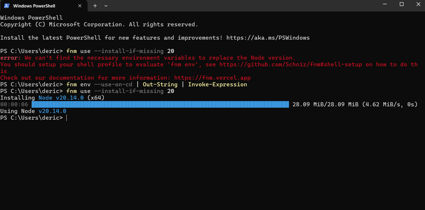 ps:> fnm env --use-on-cd | Out-String | Invoke-Expression