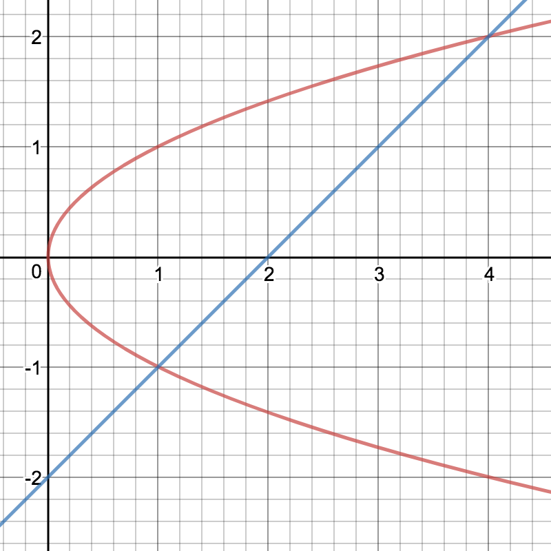 As for how to determine that inequality, you could do it by algebra, but the quickest way is probably with a graph. You know that $x=y^2$ is a parabola with its vertex at the origin, and which opens to the right. The line $y=x-2$ passes through $(0,-2)$ and $(2,0)$.