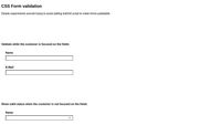 If you're using React / ReactDOM, make sure to turn on Babel for the JSX processing. If active, Pens will autosave every 30 seconds after being saved once. If enabled, the preview panel updates automatically as you code. If disabled, use the "Run" button to update. If enabled, your code will be formatted when you actively save your Pen. Note: your code becomes un-folded during formatting. ... Visit your global Editor Settings. ... <h2>CSS Form validation</h2> <p>Simple experiments around trying to avoid adding bullshit script to make forms palattable</p> <form> <strong>Validate while the custo