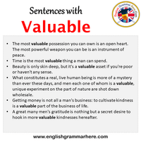 May 17, 2020 - Examples of how to use the word “valuable” in a sentence. How to connect “valuable” with other words to make correct English sentences. valuable (adj): worth a lot of money Use “valuable” in a sentence I learned a valuable lesson today. Time is our most valuable resource.