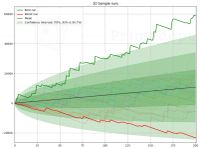 It calculates confidence intervals for your true win rate analytically as well as calculating potential graphs via simulation. In this case it ran 1000 simulations, and the worst graph in that set of 1000 simulations was the dark brown one and the best one was the blue one. However the light and dark green quantiles are smooth rather than stochastic because they are calculated analytically using the observed win rate (58bb/100) and standard deviation (119bb/100) that you input to the calculator. 58bb/100 is an unbiased estimate of your true win rate but it’s a very noisy estimate. The 95% confidence interval means that under repeated trials of 1000 simulations it will cover that true win rate 95% of the time. It also provides a similar probability calculation of 97.44% of having an observed win rate better than 0bb/100 if your actual win rate was 58b/100 if you ran a new simulation. It’s calculating the confidence interval for every single time point. You want to compare the confidence intervals for your observed win rate (58bb/100) under different standard deviations. In theory full ring games should have lower standard deviation than heads up or 6max but that’s probably not the case in cash games that are so soft you can win 58bb/100. If you want a very conservative estimate of the uncertainty of your win rate you should try standard deviations of 150 or even 200 if that’s a good description of the games you play in.