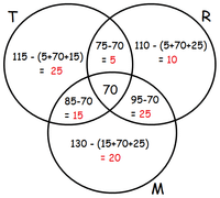 Thus $x \geq |A|+|B|+|C| - 2\cdot40 = 20$, because $40 \geq |A\cup B\cup C|$.