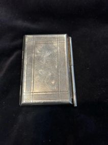 It's a cigarette case, not a biz card holder. Alpaca silver is actually a Nickel alloy. Here is a very good link to the history of Alpacca silver. [history of alpacca silver](aca silver explained]( https://www.mgsrefining.com/blog/what-is-alpaca-silver/ )) More on reddit.com