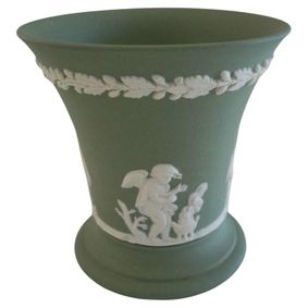 WEDGWOOD - Vintage green Jasperware 4 Seasons vase - featuring cupids in separate vignettes with a foliate border to the top - matte finish throughout - signed on the base - United K... ... COPELAND SPODE (Manufacturer) - Blue Italian (Pattern Name) - Victorian style transfer decorated ceramic cabinet plate in blue - featuring a bucolic landscape to the center with a fl...