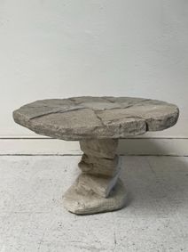 An ancient outdoor stone table or stand. Two piece design with amazing patina. ... This lovely round table is one of 7 limestone tables that were reclaimed from a private Italian Villa prior to renovation. We love the texture, color and distressed patina on this n... ... Round vintage slate side table from France, raised upon two-part shaped slate base.