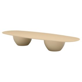 Inspired by minimal center plinth dining tables, we engineered our extruded aluminum to achieve this look as an exercise in simplicity and bold geometry. A singular hollow plinth of extruded aluminum with gentle curved edges supports the beveled top engineered in Travertine stone - supported by our aluminum honeycomb sub structure for support and resilience. A perfect and timless table with seating for many FEATURES• Frame handcrafted of extruded aluminum in our workshop