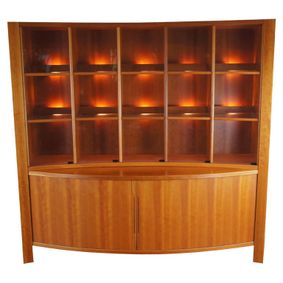 An exceptional Vintage Scandanavian Modern Breakfront, Made in Denmark. Features a curved form made teak with a divided and illuminated back lit curio showcase along the top over a... ... Handsome handmade reclaimed teak cabinet having glass paneled doors with key and 4 interior shelves.